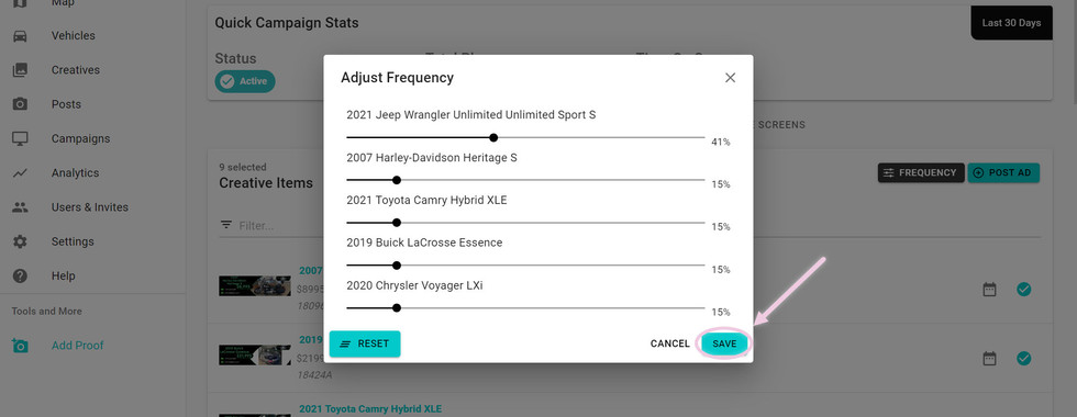 A window will open that lists each of your creatives running and a slider to control the frequency. For each creative, move the slider to the left to run it less frequently or to the right to run it more frequently. The reset button will default all the creatives to running equally. Be sure to click save once you have the frequencies set the way you wish.