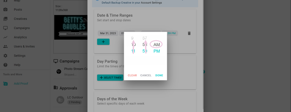 Reminder: updating the Day Parting, Days of the Week, and Selecting Screens will change how the frequency works. If you have a creative scheduled for only Mondays while the rest of your creatives are on all days of the week that one creative will run less since it can only run on one day.