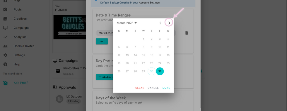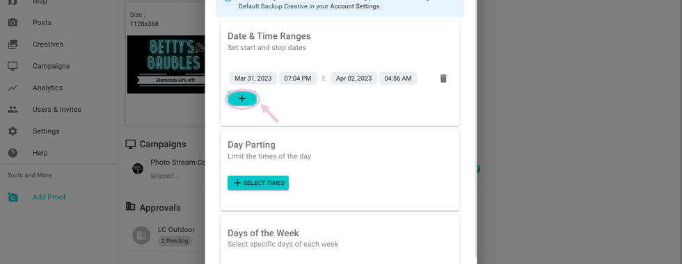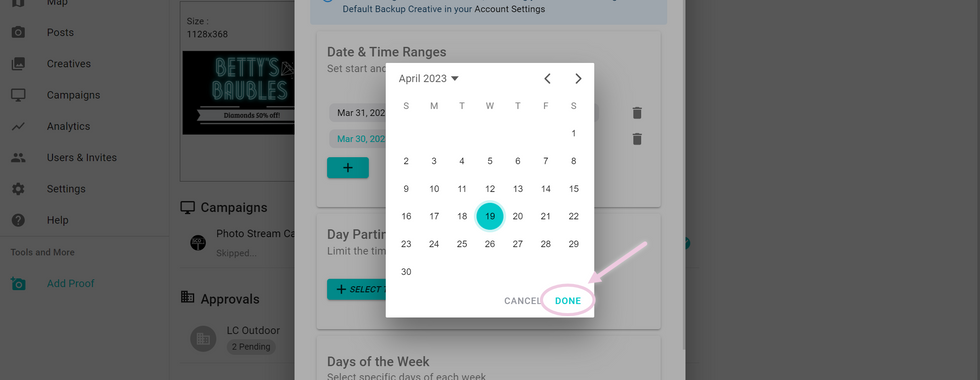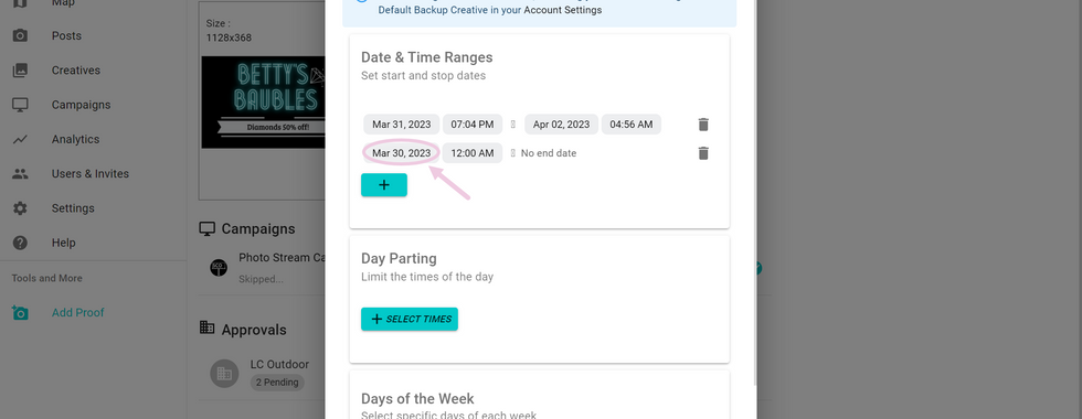 From the calendar icon you will be able to set Start and Stop dates, limit the times of the day for an ad, or select specific days of the week for an ad to play.